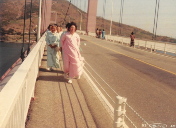 남해대교는 73년도에 개통한 남해의 노량리에서 하동의 노량리를 잇는 현수교이다. '남해대교를 걸어서 건너면 무병장수한다'는 설에 따라 다리를 걷는 것이 남해대교 관광의 백미였다. 사진에는 영희의 엄마가 앞장서고 그 뒤로 큰할머니와 부천할머니를 비롯해 여러 명이 남해대교 위를 걷고 있다. 우리 할머니들은 무병장수해서 아들 며느리 고생 안 시키고자 하는 바람으로 한 발 한 발걸음을 내딛지 않으셨을까?