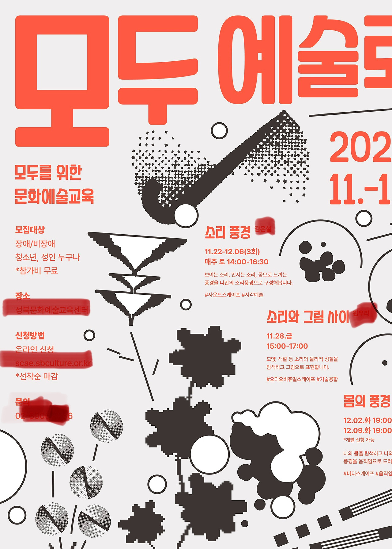 몸으로 풍경을 만드는 워크숍 자리를 만들어 준 우리 동네 예술문화센터 담당자들이 대단하다는 생각이 든다. ‘모든 워크숍은 수어통역이 제공됩니다’라고 쓰여있는 이번 활동의 포스터를 보니 구청과 지역의 문화재단, 문화예술교육센터, 수어통역센터에서 함께 준비한 프로그램이었다. 우리 동네가 자랑스럽다. 이런 워크숍 프로그램이 더 많아져서 더 많은 사람들이 함께 하면 좋겠다.