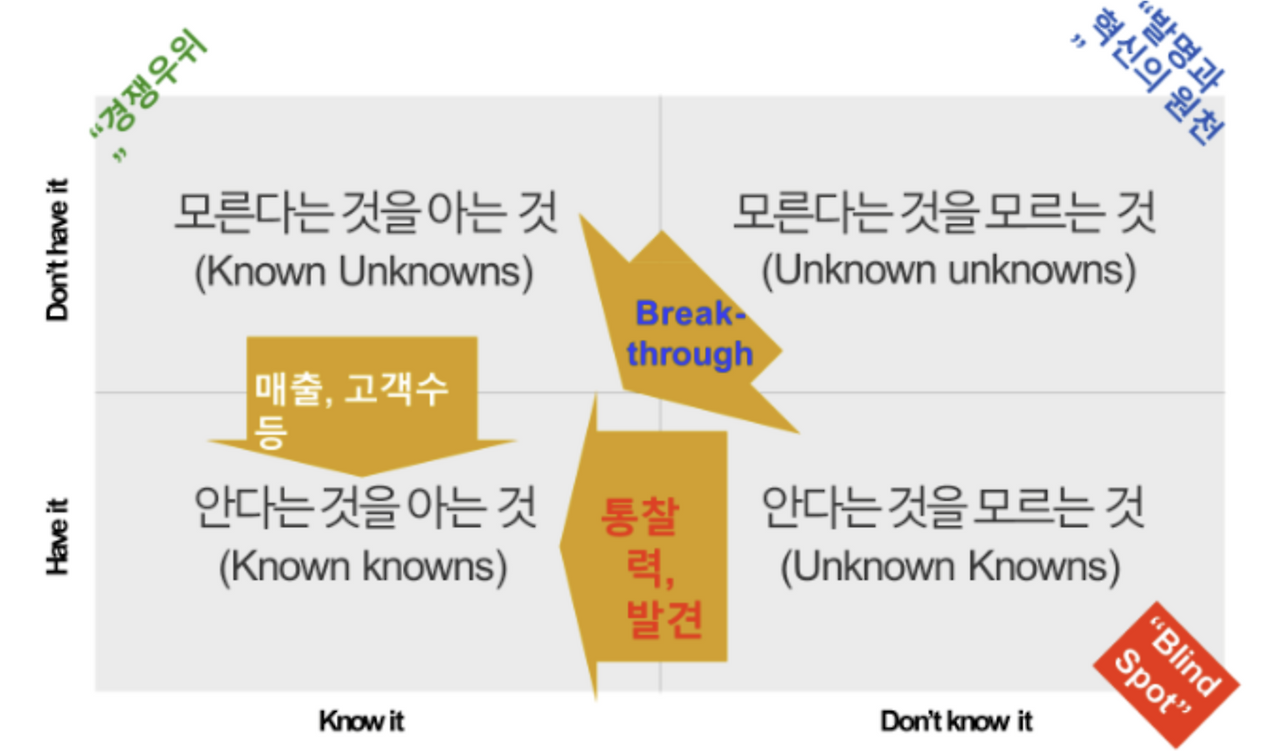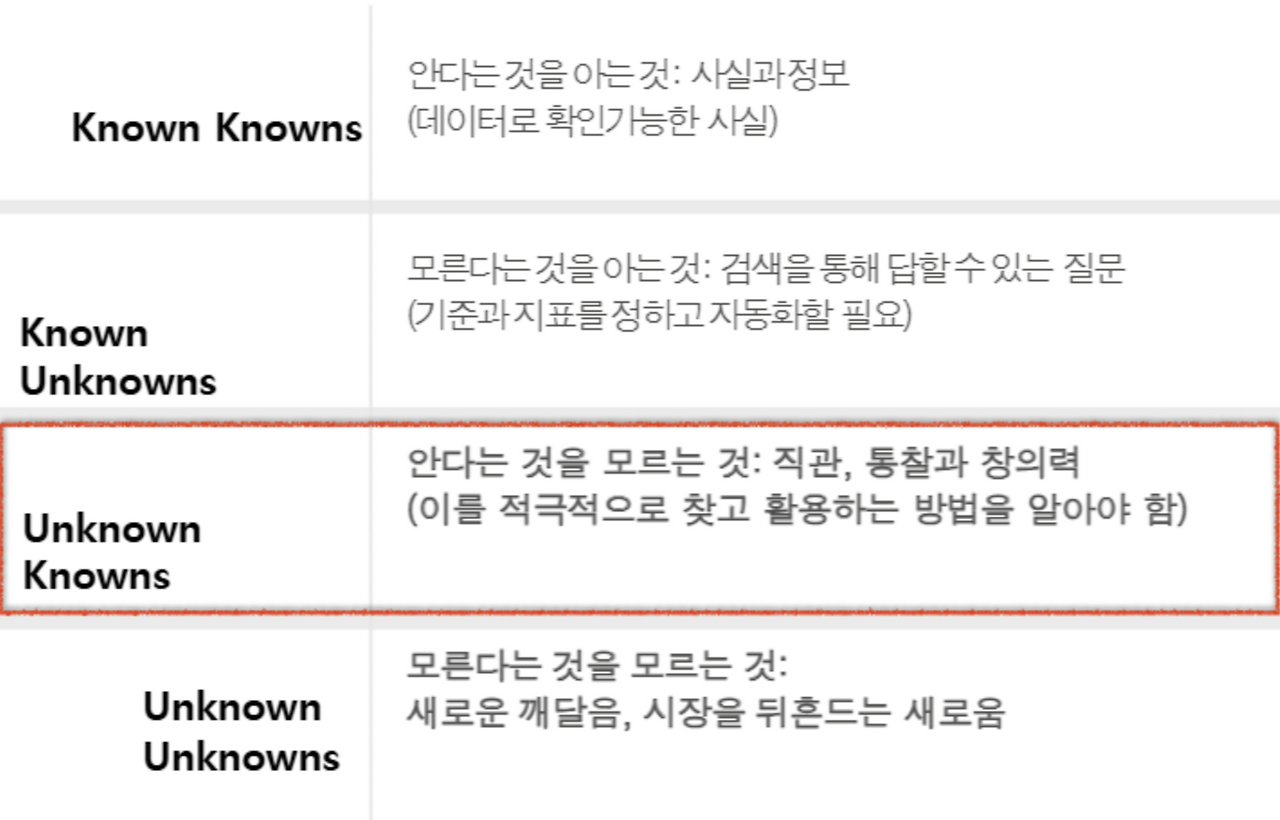 한편 Unknown Knowns는 데이터나 경험의 형태로 이미 존재하지만, 그 의미를 인식하거나 활용하지 못하는 상태를 말한다. 오늘날 기업 환경에서는 서버 로그나 과거 고객 기록처럼 잠재적 가치를 지닌 다크 데이터가 대표적인 사례라고 볼 수 있다. 마지막으로 Unknown Unknowns는 존재 자체를 예상하지 못한 불확실성의 영역이다. 예상 밖의 기술 혁신이나 급격한 사회 변화처럼 전략적으로 큰 영향을 미칠 수 있는 요소들이 여기에 포함된다.