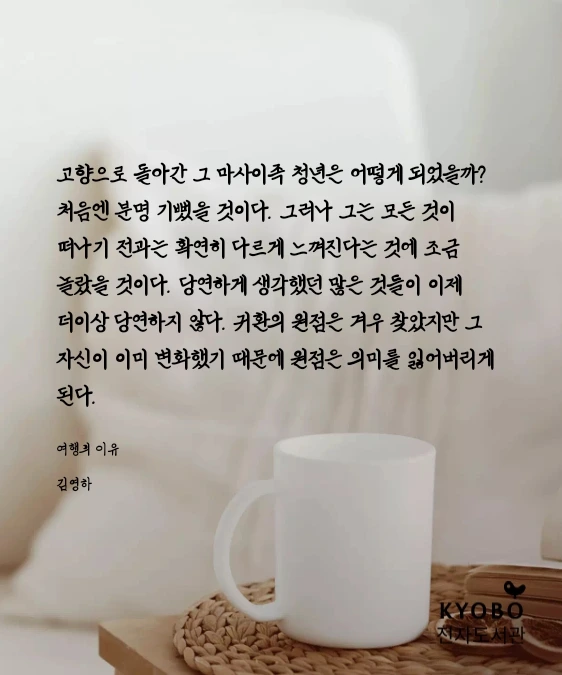김영하 작가의 이 문장을 곱씹으며, 나의 삶 또한 하나의 여행임을 인정하게 된다. 한국에 대한 그리움, 떠돌이 같은 나의 발자취, 그리고 매일 읽는 책이 내게는 귀환의 장소가 되어주고 있다. 결핍이 있기에 더 깊이 성장할 수 있고, 그 결핍을 메우는 언어와 기록이 있기에 삶은 조금 더 단단해진다.