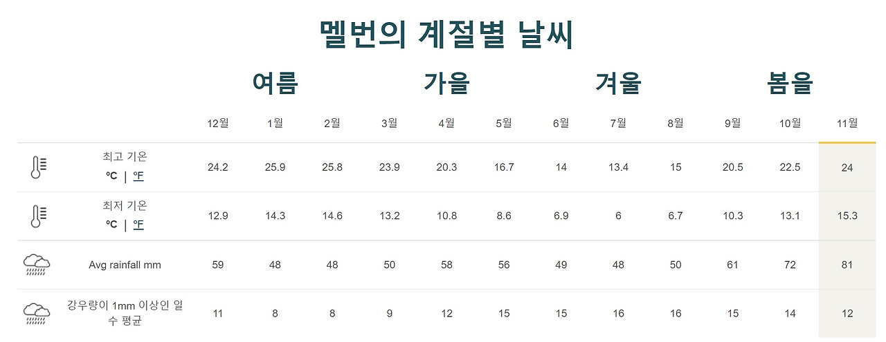 멜번을 설명하는 말 중에 "멜번에는 하루 4계절이 있다"는 말이 있다. 11월~12월 멜번의 날씨는 우리나라 5월~6월 정도. 12월의 경우 한낮에는 덥고, 그늘에서는 시원함을 느낄 수 있다고 한다. 그런데 날씨가 좋지 않은 날이나 저녁에는 따뜻한 겉옷이 필요하단다.