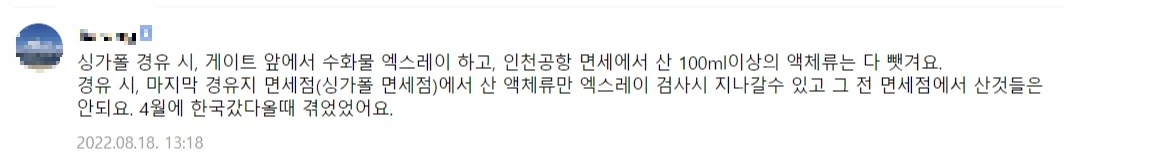 한복 모양의 와인 커버친구가 부탁한 진로 헤리티지는 면세점(인천공항 경복궁에서 10만 원 정도에 판매)에서 사갈 생각이었으나, 싱가포르에서 환승하는 경우 인천공항에서 구매한 100ml 이상 액체류는 가지고 탑승할 수 없다고 한다. 일반 화장품의 경우는 포장을 뜯어 투명 지퍼팩에 담아서 가지고 통과했다는 후기들은 있었다.