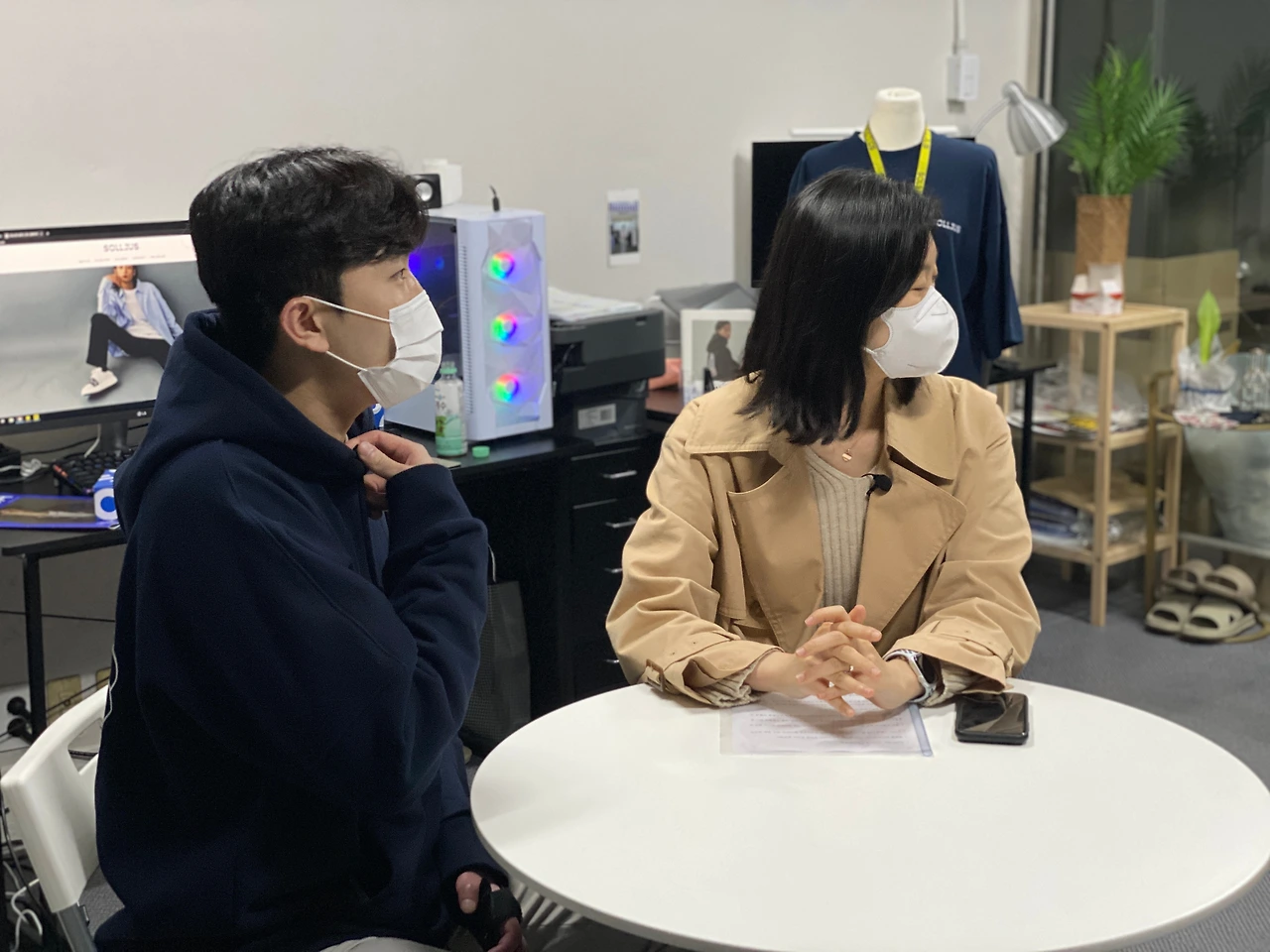 네, 저랑 동업자 한 명이 있는데 상품 기획, 그리고 원단의 선택, 패턴 개발, 그다음 제품 생산, 핸들링이라고 하거든요? 유통하고 온라인, 오프라인 판매까지 직접 모두 다 하고 있습니다.