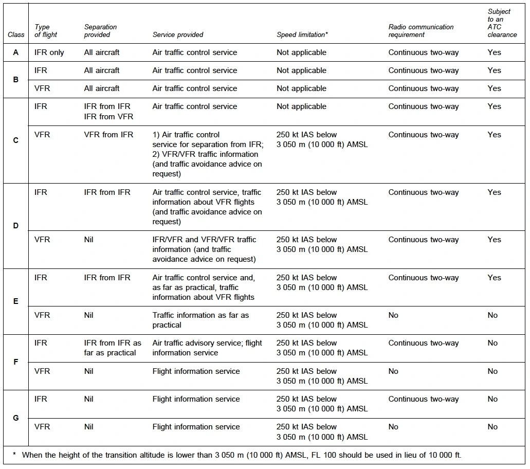 한국은 SFC~1000ft AGL/MSL (Class G), 1000~MEA(Class E), MEA~FL200(Class D), FL201~FL600(Class A), FL601 부터는 Class G 이다.
