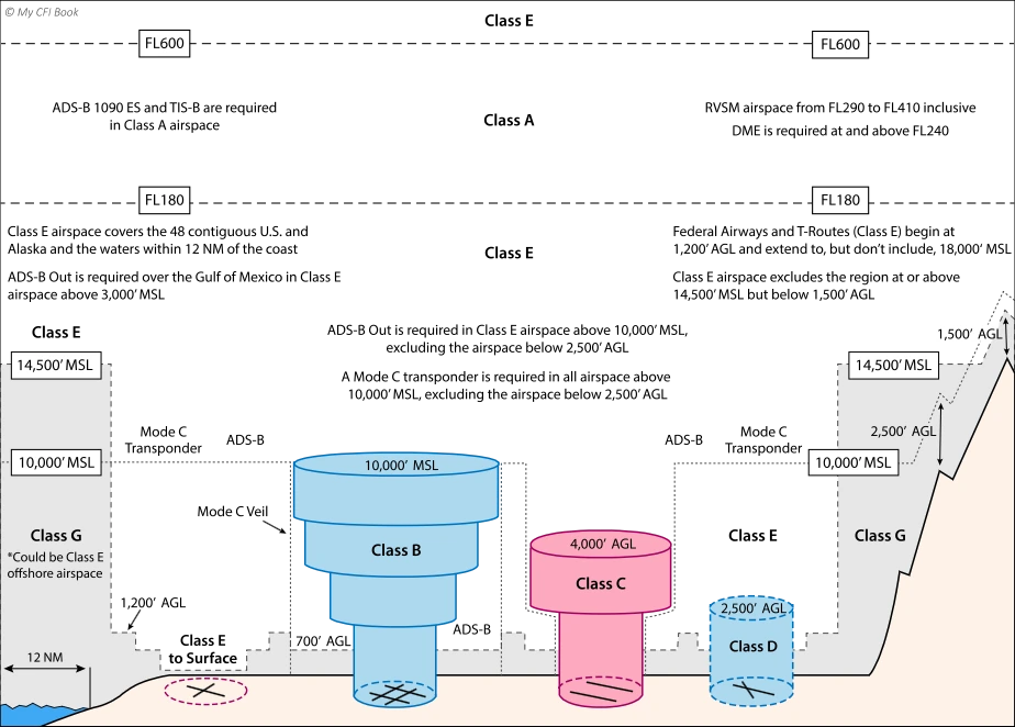 간단하게 항공로를 기준으로 설명하자면 미국은 1200ft AGL ~ 17999ft (Class E), 18000~59999ft(Class A), 60000ft 이상은 Class E 이지만