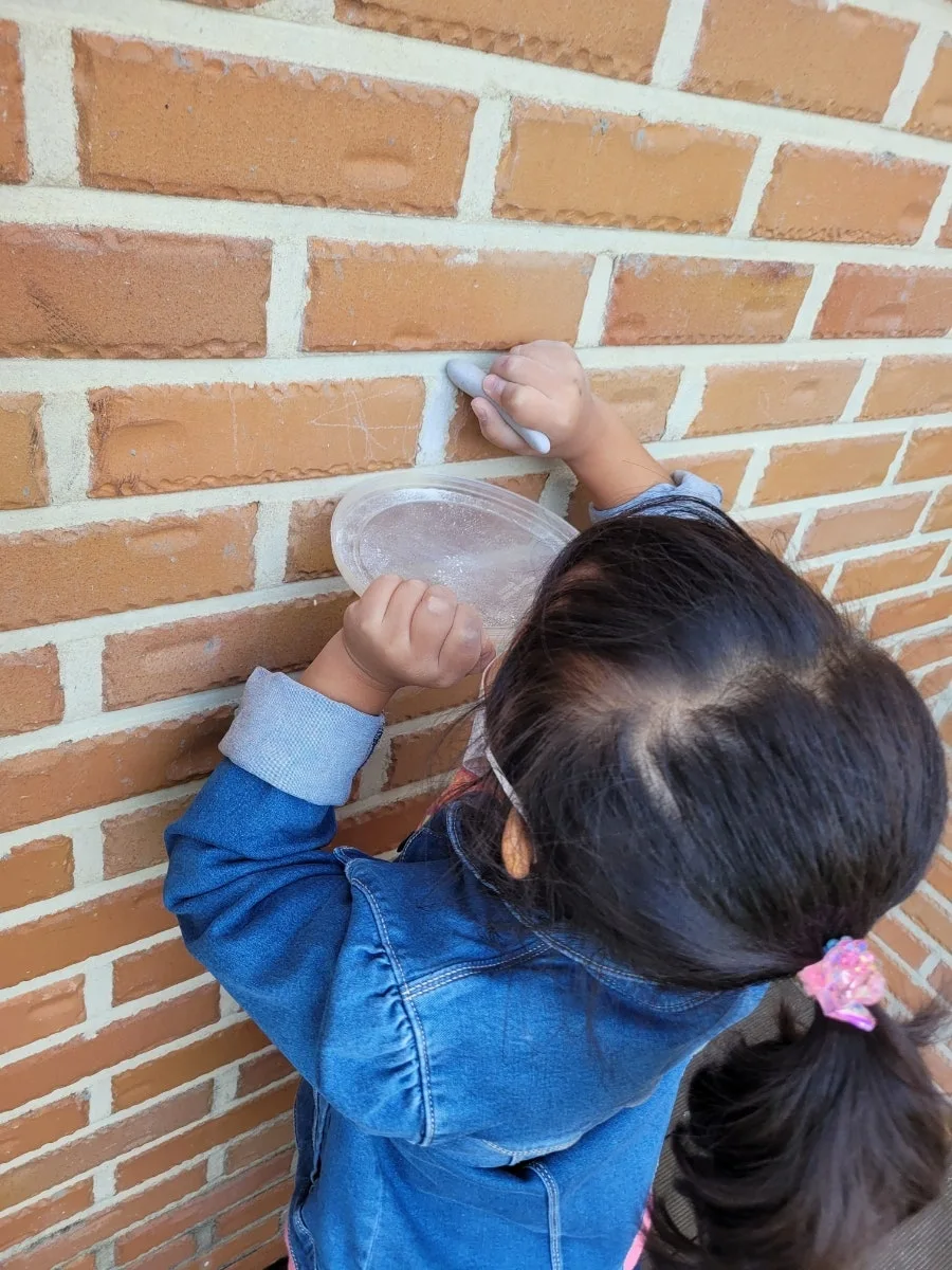 아이들은 돌로 메지를 파내는 놀이를 발견했다. 벽돌사이에 구멍이 뚫렸다. 그림 그리는 도구가 파내는 도구가 되었다.