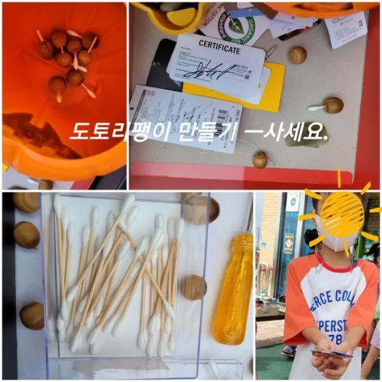 어제 못 준 친구들에게 주기위해 나는 도토리팽이 50개만들기 도전하고ㅡ 아침부터 바깥놀이터 입구에 도토리팽이를 만들어 파는 좌판을 열었다.