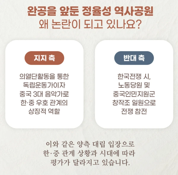 광주에서 태어나 학창 시절을 보냈지만, 중국과 북한의 군가를 작곡하고 한국전쟁에 적국의 군인으로 참전한 정율성을 기념하는 것이 국가 정체성 문제를 불러올 수 있는 문제의 소지가 있는 것은 아닌지 회의할 수 있다. 정율성을 항일 독립운동가로 기념하는 것이 역사적인 사실에 맞는지 그의 음악적인 성취를 지나치게 미화한 것은 아닌지 의문을 제기할 수도 있다. 변화하는 한중관계에서도 정율성 사업이 여전히 한중우호와 중국 관광객 유치에 실효성이 있는 사업인지 의문을 표하는 것도 지극히 자연스럽다.