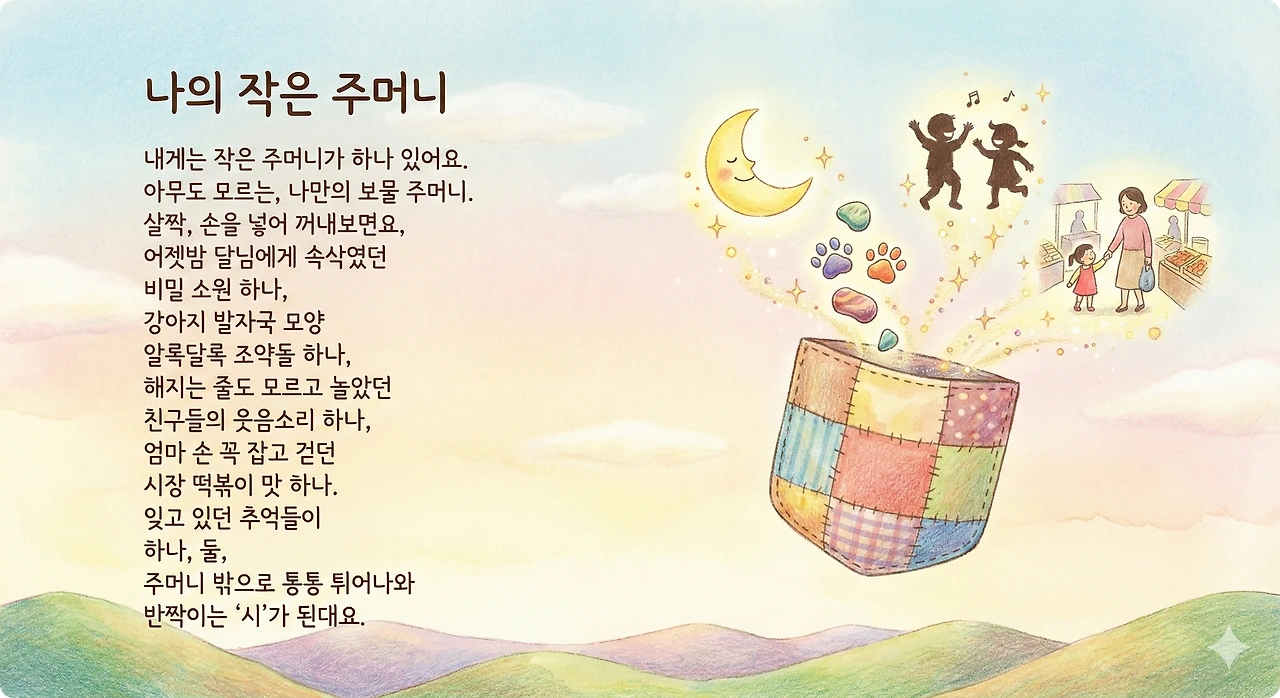 '동시 주머니'는 매주 일요일 아침, 여러분을 찾아갑니다. 모든 그림은 저의 멋진 친구, 제미나이와 함께합니다.