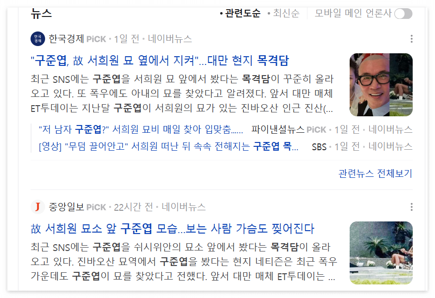 퇴근길에 '구준엽 목격담'이라는 기사를 봤다. 지난 2월 세상을 떠난 아내 서희원의 묘를 아직도 매일 찾고 있다는 내용이었다.
