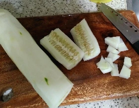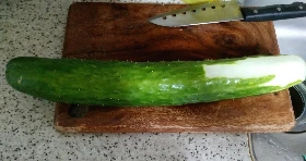 오이는 도마 길이보다 길었으며 안에 씨도 많다.