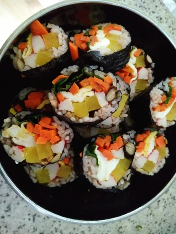 깻잎을 넣어서 김밥을 만들어 보았다. 진한 깻잎 향이 좋다.