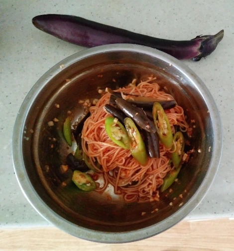 가지와 이오를 가지고 비빔국수를 만들어 봤다. 고추씨가 씹히고 마늘의 알싸한 맛이 씹혀서 더위를 잠시 잊게 해 준다.
