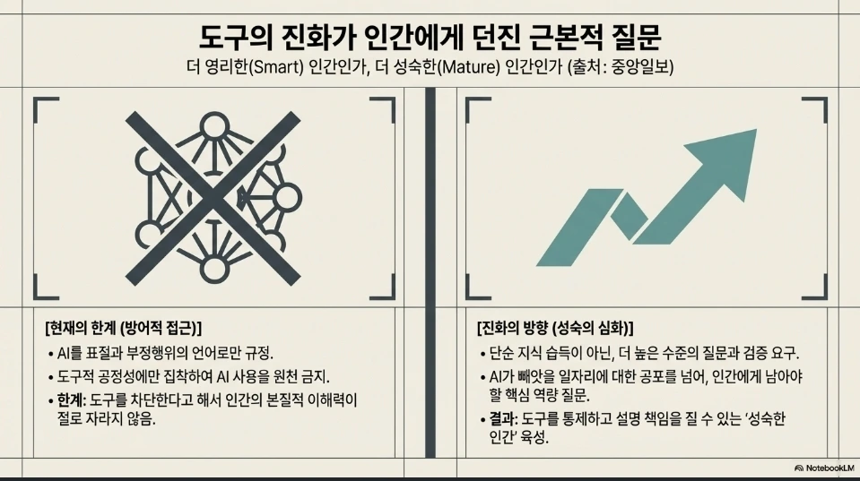 C: 이러한 점에서 AI 시대를 맞은 학교의 태도는 아쉽다. 적지 않은 교실에서 AI를 표절과 부정행위의 언어로 다룬 것이다. 공정성은 중요하나 도구를 금지한다고 해서 이해력이 절로 자라지는 않는다. 더 높은 수준의 질문과 검증, 설명 책임을 요구해야 하며, 가치력과 책임감, 이해력을 같이 가르쳐서 성숙의 심화로 연결시켜야 한다. AI 시대는 더 영리한 인간이 아닌 더 성숙한 인간이 그 시대를 이끌 것이다.