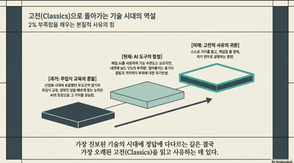 매일매일 AI를 사용하다 보면 기능 숙련도가 조금씩 오르기는 합니다만, 늘 2%가 부족하다는 생각이 저의 깊숙한 곳에서 맴돕니다. AI 네이티브에게 필요한 것이 가치력과 책임감과 이해력이라면 이는 오히려 저 자신에게 되물어야 할지도 모릅니다. “정말 나 자신은 가치력을 갖고 있는가? 그리고 책임감 있게 AI 결과물을 생성해 내는가? 그리고 그것을 나 자신의 말로 이해할 수 있는 이해력을 갖춘 것인가?” 귀차니즘인지 뭔지 몰라도 그런 질문에 대해 깊은 생각을 해보지 못한 듯합니다. 무엇보다도 가치력이 부족하다는 생각을 해보는데, 기사에서 언급했다시피 창의력을 끝까지 밀어붙이는 힘이 저에게는 부족하거나 모자라다는 생각이 듭니다. 이것이 교육의 문제일 수도 있습니다. 주입식 교육의 문제... 옛날에는 산업화시대다 보니 그것이 통할 수 있었습니다. 그런데 지금은 AI 시대가 되면서 시대가 필요한 인간상이 달라진 것입니다. 무조건 암기하는 것이 아니라, 창의력을 내고, 이것을 밀어붙이는 용기와 책임질 줄 아는 힘, 그리고 자신의 말로 생성물을 설명할 수 있는 이해력이 필요한 것으로 봐서는, 고전을 자주 읽어봐야 할 것 같다는 생각을 하게 만듭니다. 역시 고전을 읽어보는 것이 정답에 다다를 수 있는 방법이 될까요?