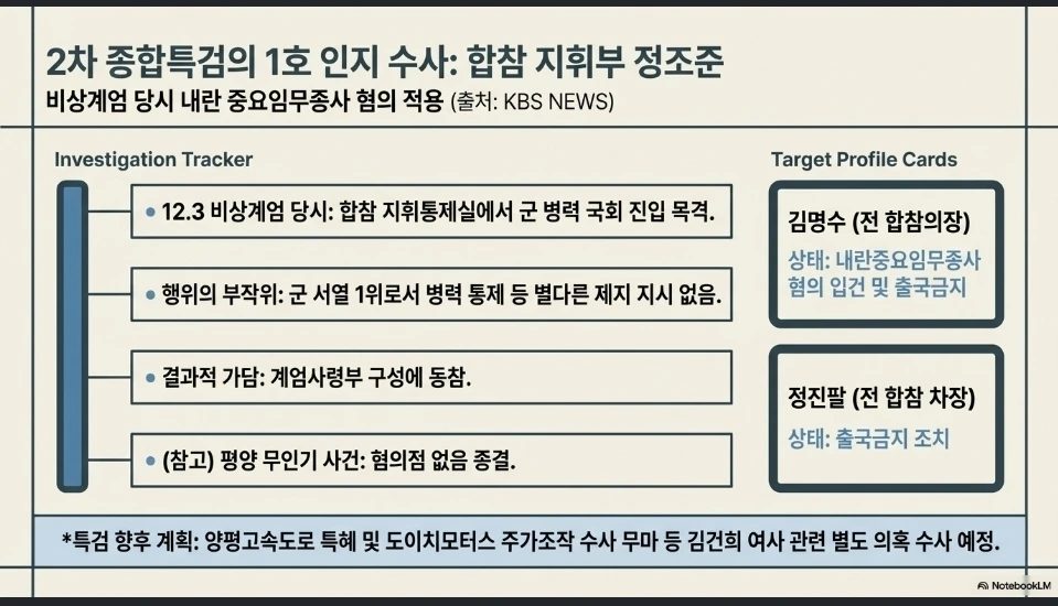 P1: 권창영 종합특검팀이 공식출범 2주 만에 '1호 인지 수사'에 착수했는데, 김명수 전 합참의장을 내란중요임무종사 혐의로 입건하고 출국금지했고, 이어서 정진팔 전 합참 차장 등 비상계엄 당시 합참 주요 인사들도 출국금지했다.