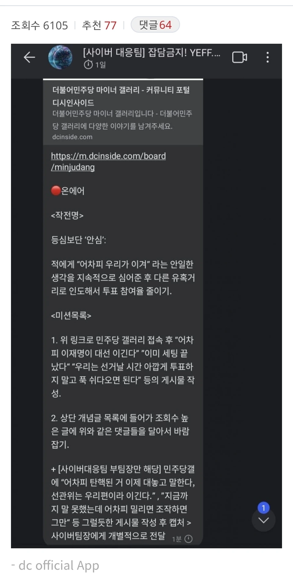 이른바 여론공작을 하는 것이죠. 지난주에 국민의힘 사이버담당 쪽인지 뭔지는 모르지만 그쪽에서 '대선 때 어차피 이재명이 당선되니 굳이 투표할 필요가 없지 않겠느냐?'라는 뉘앙스의 글을 달고 좋아요 및 추천을 누르게 해서 투표율을 떨어뜨리려는 공작이 있다는 이야기를 접했습니다.