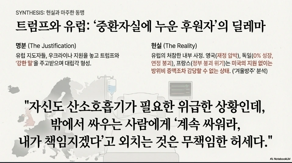 3. 우크라이나... 유럽... 문제군요. 각자 자신들의 이해관계가 얽혀있으니 협상에 난항이 있을 수밖에 없죠. 더군다나 언급된 영국, 프랑스, 독일은 각각 성장둔화, 정부붕괴, 무성장 위기를 겪고 있는 국가입니다. 그들의 입장에서 미국과 러시아의 안대로 간다면 유럽은 방위비 지출이 더 늘어날 것입니다. 그럴 경우, 영국은 재정 압박 속에서 NATO 핵우산 약화에 직면할 것이고, 독일은 0% 성장과 연정 붕괴의 문제로 방위비 지출에 부담이 오고, 프랑스는 정부 붕괴로 '전시 경제' 전환이 지연되며 EU 주도 안보 영향력이 약화됩니다. 그런데다 미국이 지원철회를 할 경우 유럽이 떠안아야 하는데, 영국, 독일, 프랑스는 안 그래도 내부사정이 좋지 못한 상황에서 큰 피해를 입게 될 겁니다. 이래저래 우크라이나만 피해를 입게 생겼지만... 모르겠습니다. 어떤 양상으로든 전쟁은 끝났으면 합니다.