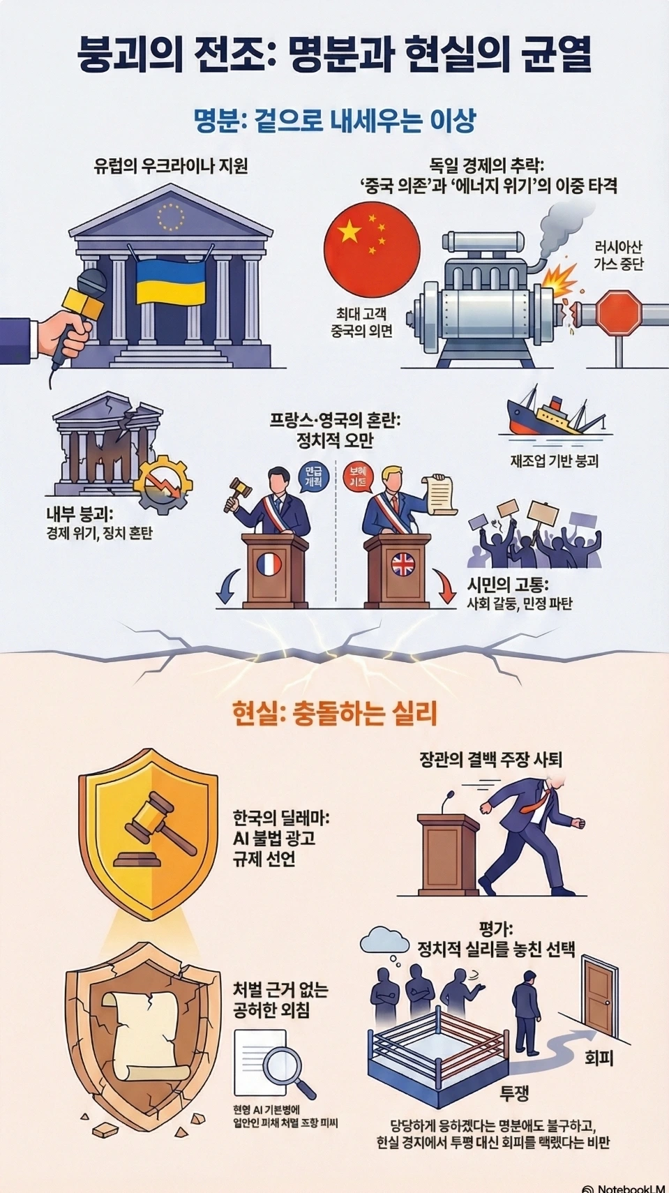 P1: 트럼프가 스타머·마크롱·메르츠와 전화로 "pretty strong words(아주 강한 단어)"를 주고받았다. "유럽 쇠퇴" 묘사와 국가안보전략 "문명 소실 위험" 인용을 통해 이민이나 우크라이나에 대한 이슈 연계를 시사한다.