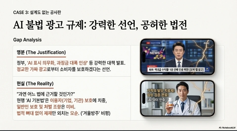 2. AI기본법에서 이용자(기업, 기관)만 보호하고, 영향을 받는 일반인에 대해서는 보호가 미비하거나 전무한 경우가 있죠. 윤리문제에 대해 법률, 시행령이 미비하다는 비판이 나오지요. 그러니까 이번 기사와 같은 피해가 나온다고 봅니다. 결국 이에 대해 AI를 활용한 불법 광고의 정교함과 이에 대한 법적 공백을 막기 위해 표시 의무화와 제재조치 강화를 통하여 소비자 보호와 플랫폼 책임을 강화하겠다고 했습니다. 그런데 어느 법에 근거할 생각인가요? 혹시 AI 기본법을 만들 때 처벌조항이 다른 법과 충돌해서 그런 걸까요?
