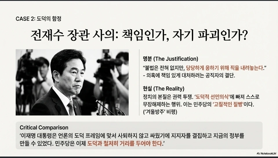 1. 민주당은 여전히 도덕의 함정에 빠져있습니다. 그러다 보니 자신의 직을 내려놓습니다. 민주당의 고질적인 질병과도 같다고 봅니다. 민주당이 도덕적인 선민의식의 우월함을 못 버리고 그렇습니다. 정말 답답합니다. 이재명 대통령이 대통령이 될 수 있었던 것도, 언론이 만들어낸 도덕 프레임에 맞서 사퇴 같은 것은 전혀 하지 않고 맞서 싸운 것이죠. 그러한 자세가 지지자들을 결집시키고, 내란을 극복하여 지금의 국민주권정부를 만든 겁니다. 이제 민주당은 도덕과 철저히 거리를 두어야 합니다.