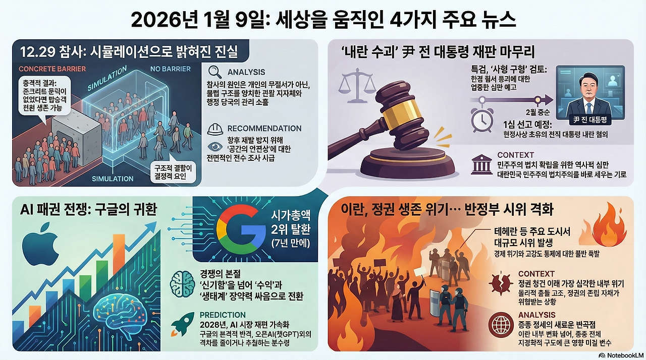 오늘 아침에 공유드릴 기사는요, 제주항공(무안공항) 참사에 대한 보고서(콘크리트), 윤석열 결심공판, 구글의 추격, 이란 반정부시위에 대한 기사입니다.