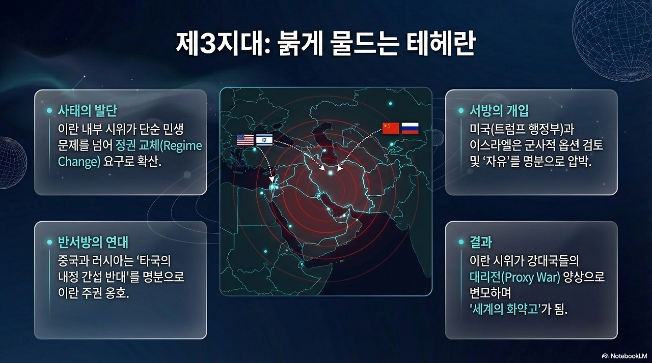 C: 이란 시위는 단순한 내정을 넘어 미·중·러의 지정학적 이해관계가 충돌하는 화약고가 되었으며, 미국의 군사 개입 여부에 따라 세계정세가 걷잡을 수 없는 혼돈에 빠질 수 있는 상황이다.