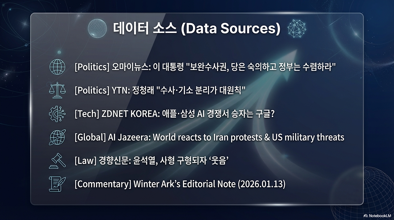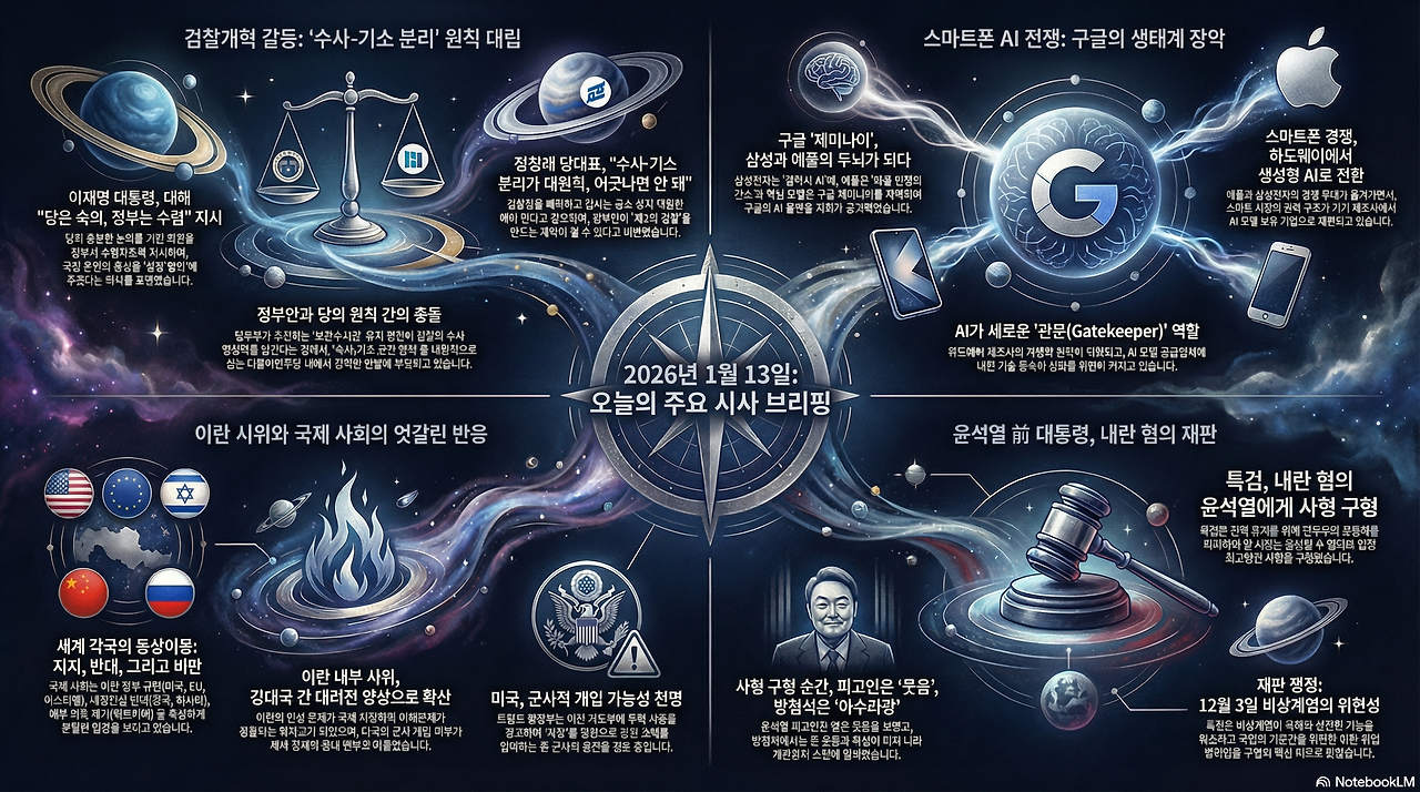 윤석열에게 사형이 구형되었습니다. 오늘 공유드리는 기사는 이재명 대통령의 중수청, 공소청에 대한 여당의 충분한 숙의와 토론을 주문하면서 이를 정부가 수렴할 것을 지시하였고, 여당 당대표인 정청래는 민주당 의원들이 검찰청 폐지 및 강력한 개혁안이 기본정신임을 강조한 부분과 함께 삼성전자와 애플, 그리고 구글의 AI 동맹, 격화되고 있는 이란시위에 대한 전 세계의 반응, 윤석열에게 사형을 구형한 내용이 담긴 기사를 공유할 생각입니다.