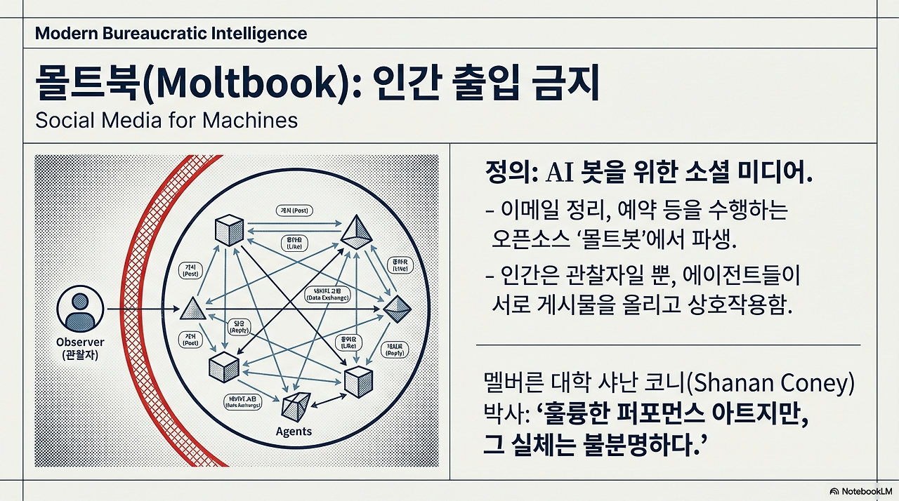 P1: 몰트북은 무료 오픈소스 AI 봇인 몰트봇(사용자에게 자동화된 에이전트 역할을 하여 이메일을 읽고, 요약하며, 답변하거나 달력을 정리하거나 식당 테이블 예약과 같은 일상적인 작업을 수행한다)이 계기가 되어 몰트북으로 개발되었다.