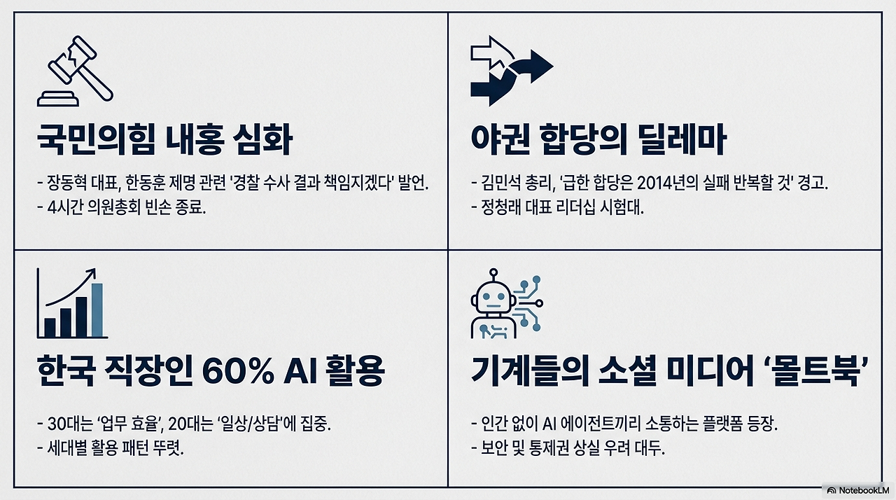 오늘 공유드릴 기사는 바로 장동혁 대표가 경찰조사에서 한동훈 전 대표에 대한 징계가 부당하다고 밝혀지만 정치적 책임을 지겠다는 내용의 기사와 김민석 총리가 합당에 대해 원칙적으로는 찬성하지만, 절차적 합의가 이루어져야 한다는 발언을 한 것, AI를 사용하는 연령대 분석 및 노션 홍보, AI 에이전트끼리의 활동과 AI의 위험성에 대한 기사입니다.