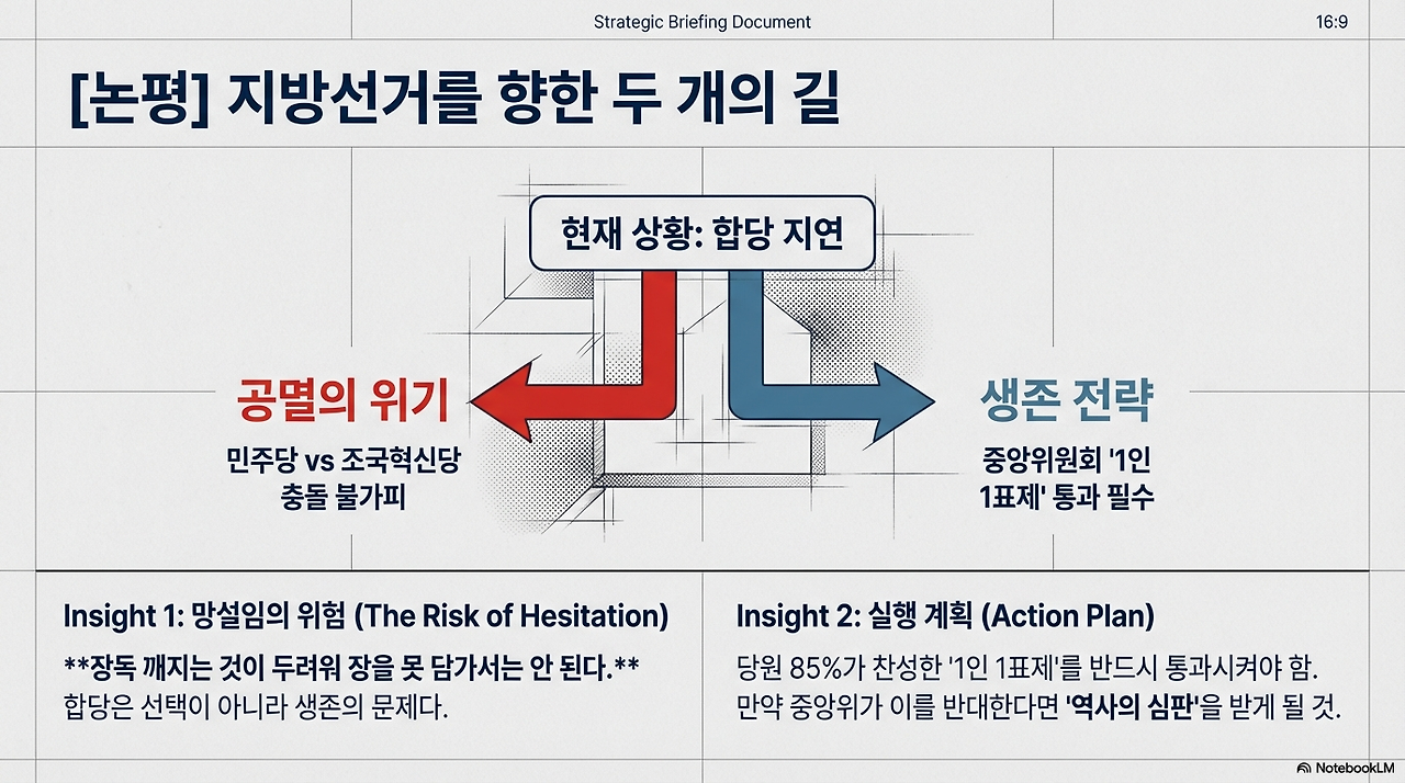 급하게 합당을 하게 되면 2014년, 민주당과 새정치연합처럼 내홍을 겪을 것이라는 이유를 들었습니다. 하지만 그러한 것이 무서워서 장을 못 담근다면 그게 맞겠습니까? 물론 유시민 작가의 말처럼 합당할 수 있을 때 합당을 하고, 안 된다면 공존을 하는 방향으로 해나가야 한다고 하지만, 우리는 합당 이외에는 다른 선택지가 없다고 봅니다. 지금 합당하지 않으면, 지방선거 때 민주당과 조국혁신당이 충돌할 가능성이 상당히 높아집니다. 정청래 당대표도 그러한 점을 알고 있기에 지금 당장의 비판을 감수해서라도 강경노선을 선택하고 빠른 속도전을 통해 통합을 완료하고 지방선거를 대비해야 합니다. 그리고 압도적으로 승리하여 내란종식을 위한 걸음을 내디뎌야 합니다. 그래야 맞습니다. 당청 간의 갈등이 어느 정도 맞다고 해도 이것을 수면 위로 끌어올리면 절대 안 됩니다. 그러는 순간 포스트 이재명은 실패할 가능성이 매우 높습니다. 물론 우리는 이재명 대통령이 장기집권을 하는 것을 원하지만, 적어도 만일의 사태에 대비하는 것도 중요합니다. 우리가 이재명 대통령 이후를 준비하여야 이재명 대통령이 퇴임할 때 물 흐르듯이 자연스럽게 연결되면서 국민주권정부가 영속될 것입니다. 개헌도 해야 하고, 지방선거도 준비해야 하고, 합당도 해야 하고... 합의의 절차를 따지고 덤벼든다면 시간은 한도 끝도 없이 늘어질 가능성이 매우 높기에 다소 비판은 받더라도 합당을 먼저 이루어내는 것이 중요합니다. 그래서 1인 1 표제가 먼저 통과되어야 합니다. 당원 중 85% 이상이 압도적으로 찬성을 했습니다. 다만 이를 중앙위원회에서 또 반대하게 된다면 중앙위는 거센 비판을 받게 되는 것도 모자라 가루가 될지 알 길이 없습니다. 당원들이 분노할지도 모를 일이고요. 중앙위는 당원들의 뜻에 맞는 결정을 하길 바랍니다. 그렇지 않다면 역사의 심판을 영원히 받게 될지도 모릅니다.