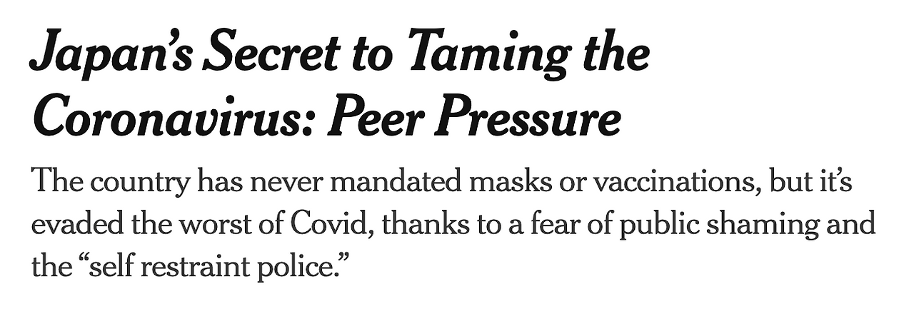 --> 일본의 코로나를 다스리는 비밀: 집단적, 사회적 압력.