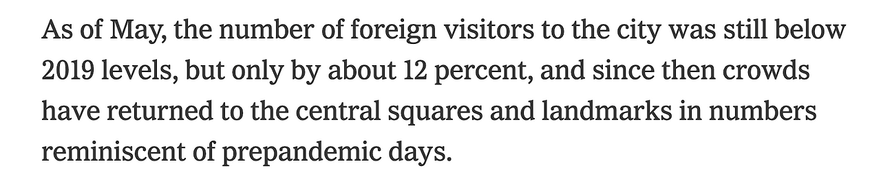 이번 5월에 외국인 관광객들의 수가 2019년 수치들보다 여전히 아래였고, 5월 이후로는 팬데믹 이전의 나날들을 연상케하는 수많은 사람들이 다시 중앙광장과 랜드마크들로 돌아왔다.