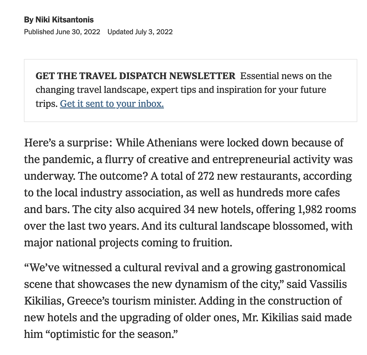 "우리는 문화적 부흥과 도시의 새로운 활력을 보여주는 요리산업을 목격해왔다." 고 그리스 관광부장관 바실리스는 말했다. 새로운 호텔들의 건설과 오래된 호텔들의 업그레이드를 더해가면서, 그는 이번시즌을 낙관적으로 본다고 말했다.