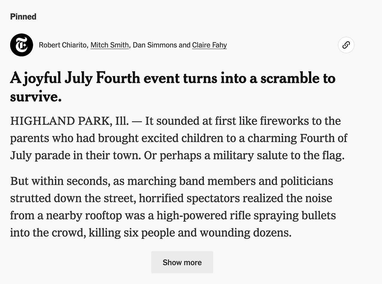 독립기념일 퍼레이드에 신난 어린이들을 데리고 왔었던 그 부모님들에게는 그게 처음에 폭죽을 터뜨리는 소리처럼 들렸습니다. 아니면 국기를 향한 군대식 인사같은 것정도로 들렸죠.