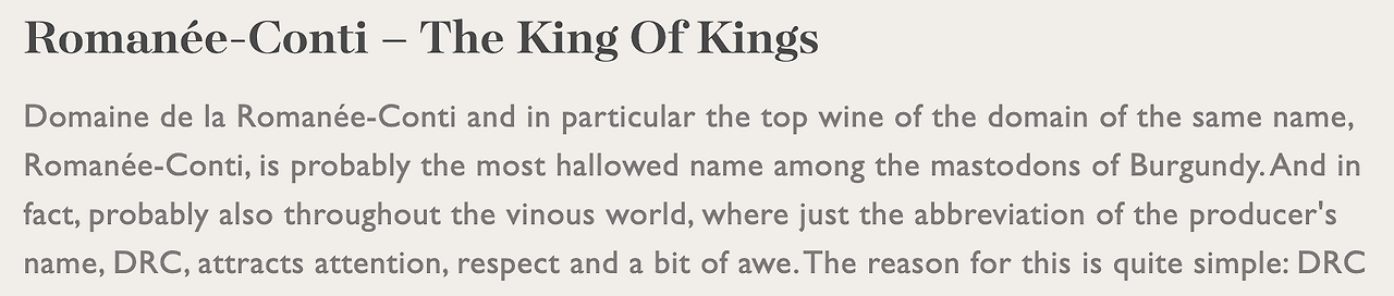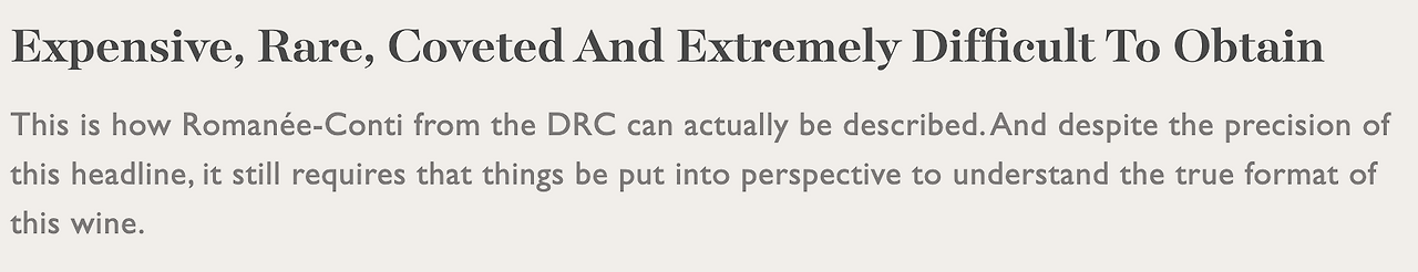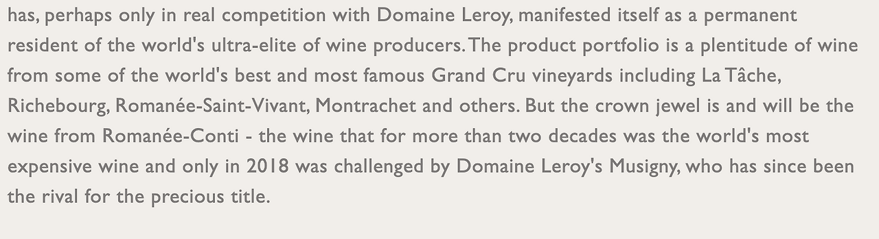 DRC has, perhaps only in real competition with Domaine Leroy, (도멘 르로이와 제대로 경쟁하는 유일한 DRC가) manifested itself as a permanent resident of the world's ultra-elite of wine producers. (그것 자체로 와인 생산자들 중 전세계 초특급의 영원한 주인으로써 분명히 드러내왔기 때문이다.) The product portfolio is a plentitude of wine (그 상품목록은 풍부한 와인이다.) from some of the world's best and most famous Crand Cur vineyards (일부 전세계 최고이자 가장 유명한 그랑크뤼 밭들로부터 오는) including La Tache, Richebourg, Romanee-Saint-Vivant, Montrachet and others. (라따쉐, 리쉬부르, 로마니 생비방, 몽라쉐와 기타 등등을 포함하는) But the crown jewel is and will be the wine from Romanee-Conti (그러나 그 최고봉은 단연 로마니꽁띠의 와인이고, 앞으로도 그럴 것이다.) - the wine that for more than two decades was the world's most expensive wine and (20년 이상동안 세상에서 제일 비싼 와인이었고) only in 2018 was challenged by Domaine Leroy's Musigny, (단 한번 2018년에 도멘 르로이의 뮈지니에 의해 도전을 받았다.) who has since been the rival for the precious title. (2018년 그 이래로 가장 고귀한 타이틀에 대한 라이벌이어왔던.)