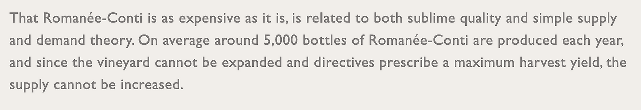 That Romanee-Conti is as expensive as it is, (그런 로마니꽁띠는 ~하는 만큼 비싸다) is related to both sublime quality and simple supply and demand theory. (탁월한 품질과 단순한 수요공급 이론과 연결되면서.) On average around 5,000 bottles of Romanee Conti are produced each year, (로마니꽁띠는 평균적으로 약 5000병들이 매년 생산된다) and since the vineyard cannot expanded(그 밭이 확장될 수 없기 때문에) and directives prescribe a maximum harvest yield, (그리고 정부의 명령이 가장 최대의 수확량을 규정하기 때문에,) the supply cannot be increased. (그 공급량은 더 증가될 수가 없는 것이다.)