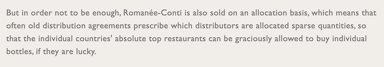 But in order not to be enough, (그러나 모자란 것을 위해,) Romanee-Conti is also sold(로마니 꽁띠는 또한 판매된다.) on an allocation basis, (배분기준에 따라) which means that often old distribution agreements prescribe (그 의미는 종종 오래된 유통계약서들이 규정한다는 것이다.) which distributors are allocated sparse quantities, (어떤 유통업자들이 조그만 양들을 분배 받을지를) so that(~하기 위해서) the individual countries' absolute top restaurants (각 국가들의 확실한 탑 레스토랑들이) can be graciously allowed to buy, (영광스럽게도 각각의 병들을 사는 것을 허락받을 수 있다) if they are lucky (만약 그들이 운이 좋다면.)