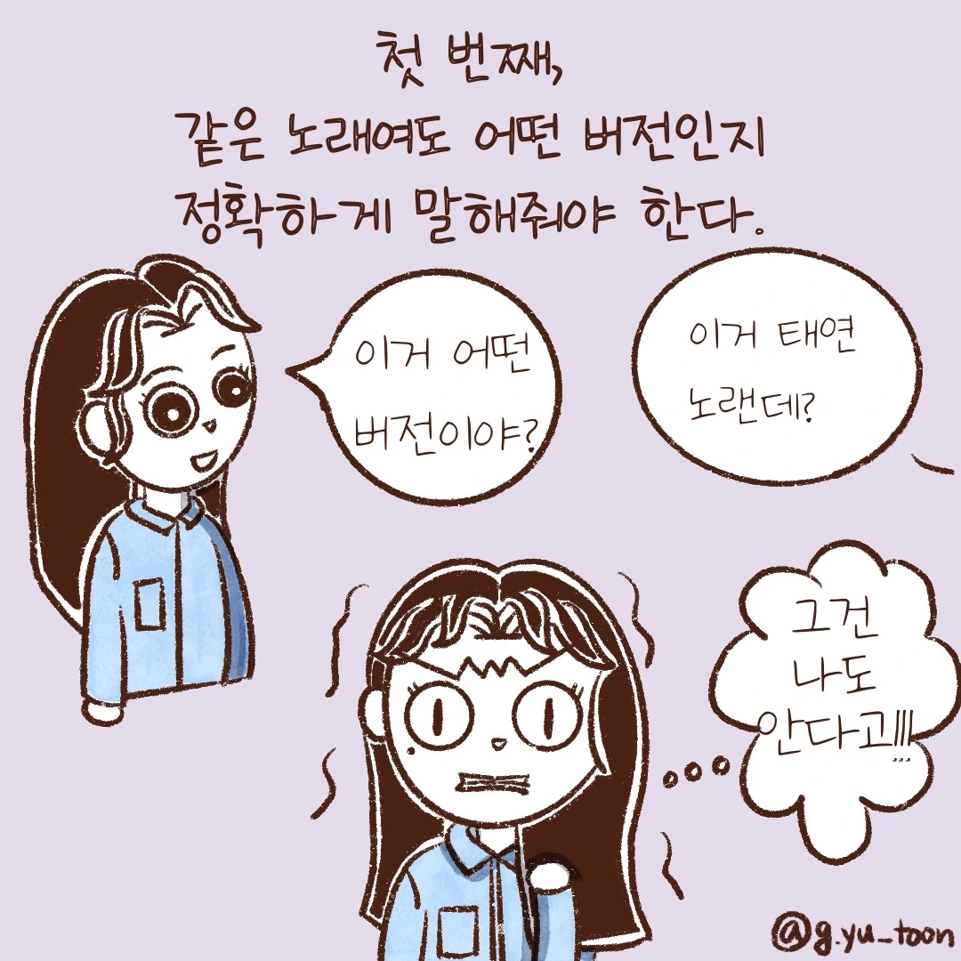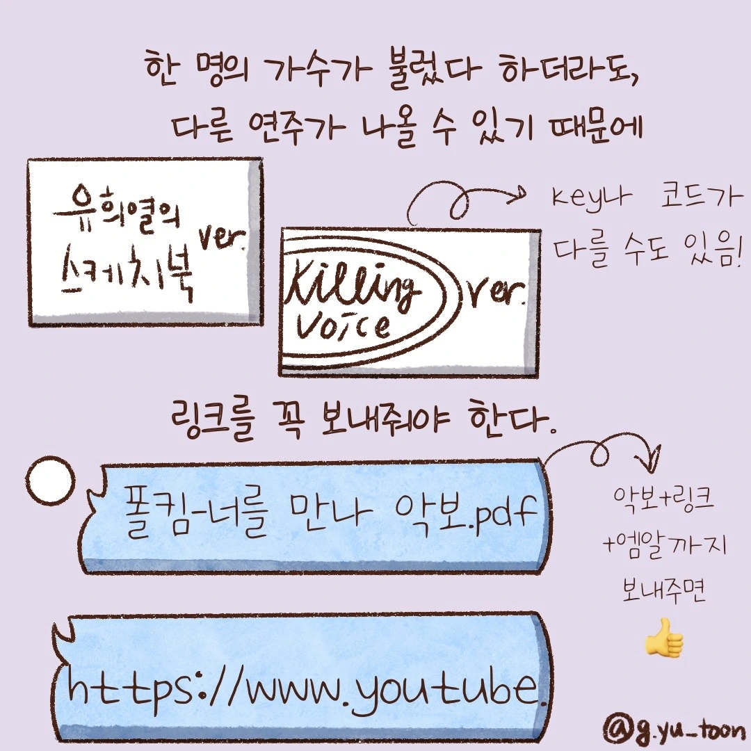 하지만 가끔 보컬들이 가요를 요청할 때 '워낙 유명한 곡이니까 그냥 악보만 주면 되겠지'라는 생각과 함께 앨범이나 버전, 링크들을 첨부하지 않는 실수를 한다. 요즘은 기존에 잘 알려진 가요들도 방송마다, 그리고 각종 라이브 버전과 유튜브에 나온 영상마다 키가 달라져 있을 수도 있고, 스트리밍 플랫폼에 올라간 원곡에는 나오지 않는 연주들이 가끔 나오기 때문에 정확한 정보와 함께 링크를 꼭 첨부해주는 것이 좋다.