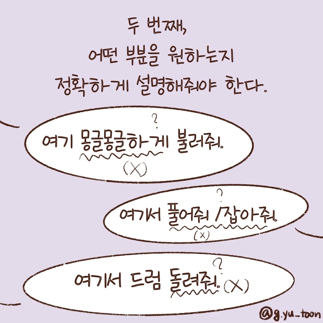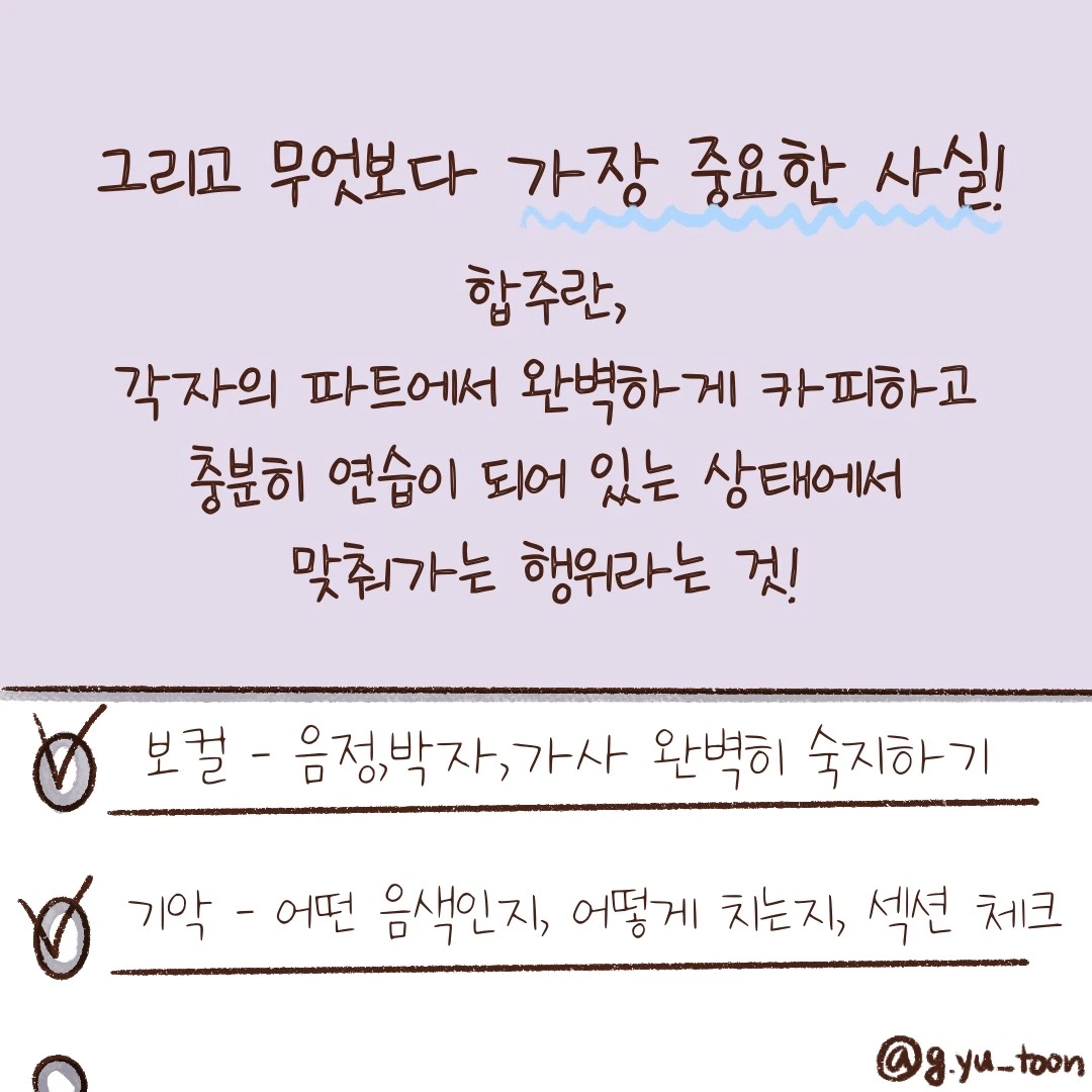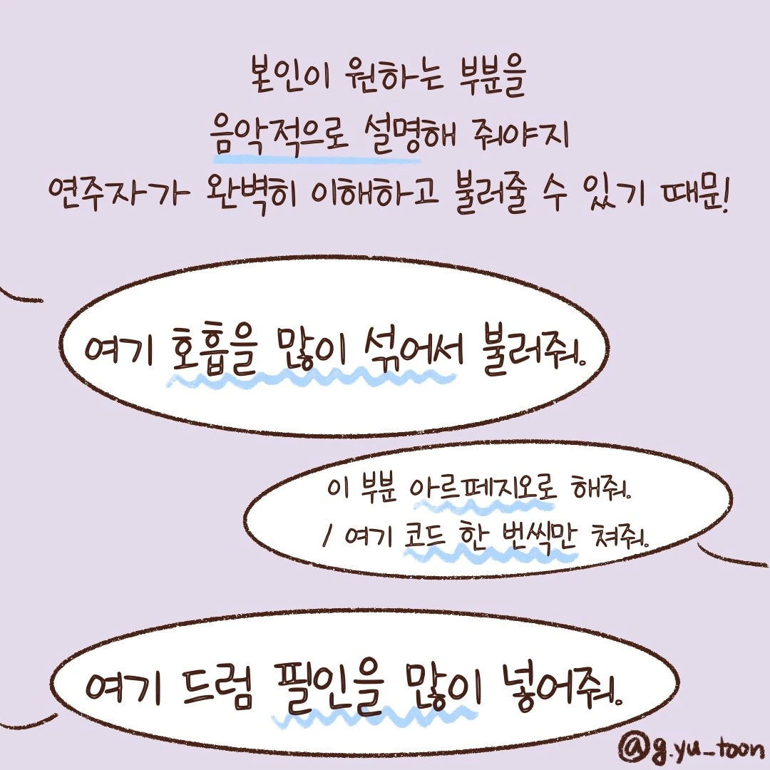 만약에 이런 소통이 제대로 이루어지지 않는다면, 연주하는 사람들도 답답하고, 요구하는 사람도 답답하기 때문에 '어떤 것을 원하는지 ' 하나하나 다 쳐보고 맞는지 아닌지를 찾아 나가는 시간이 필요하다. 하지만, 합주는 합주 전에 주어진 음악과 악보를 보고, 각자 충분히 카피와 연습 후에 만나서 완성도를 높이는 과정이기 때문에 이런 시간 낭비를 하게 되면 아무래도 합주의 질이 떨어질 수가 있다.