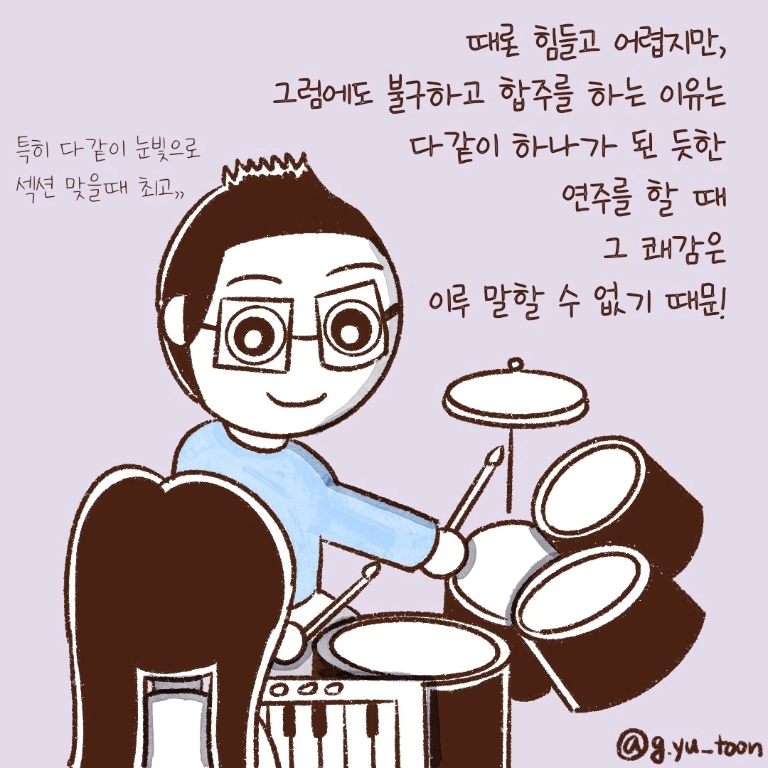 그동안 나도 몇 년간 밴드 활동을 하면서 느낀 건, 여러 사람과의 의견과 소통 속에서 교집합을 맞춰 나가야 되는 어려운 과정이지만 그럼에도 서로가 하나가 된 듯한 그 기분 때문에 밴드가 싫다가도, 가끔 밴드 음악을 듣거나 연주하는 영상을 보면 밴드가 하고 싶어 진다.