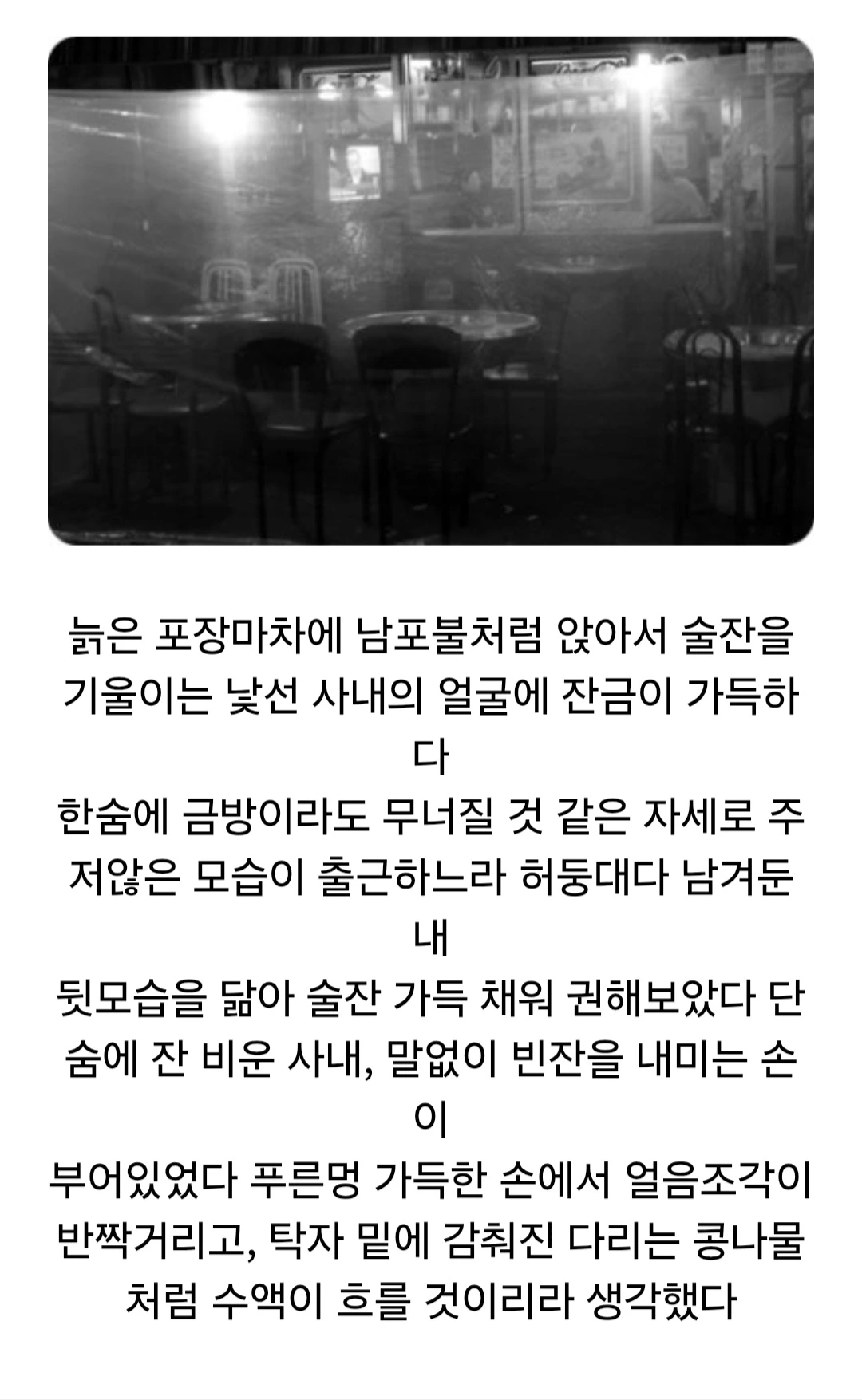 늙은 포장마차에 남포불처럼 앉아서 술잔을 기울이는 낯선 사내의 얼굴에 잔금이 가득하다. 한숨에 금방이라도 무너질 것 같은 자세로 주저앉은 모습이 출근하느라 허둥대다 남겨둔 내 뒷모습을 닮아 술잔을 가득 채워 권해보았다. 단 숨에 잔 비운 사내, 말없이 빈 잔을 내미는 손이 부어 있었다 푸른 멍 가득한 손에서 얼음 조각이 반짝거리고, 탁자 밑에 감춰진 다리는 콩나물처럼 수액이 흐를 것이라 생각했다