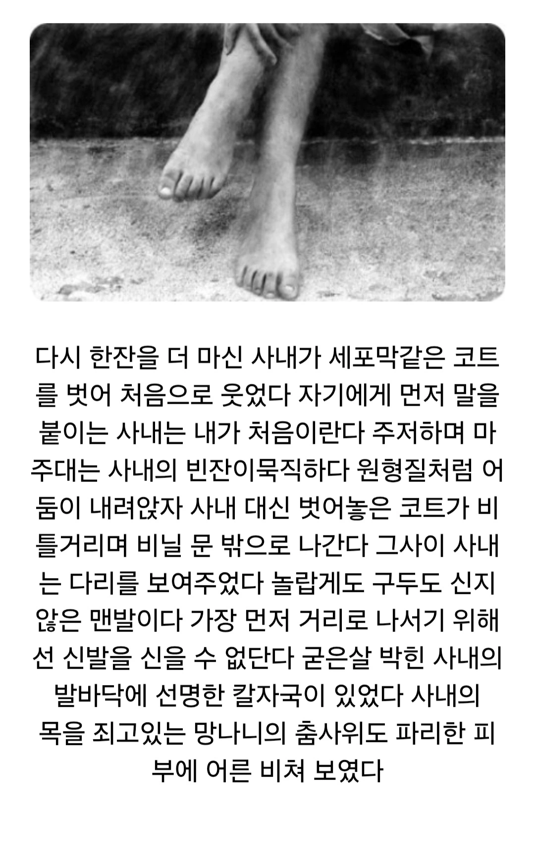 다시 한 잔을 더 마신 사내가 세포막 같은 코트를 벗어 처음으로 웃었다 자기에게 먼저 말을 붙이는 사내는 내가 처음이란다 주저하며 마주대는 사내의 빈 잔이 묵직하다 원형질처럼 어둠이 내려앉자 사내 대신 벗어놓은 코트가 비틀거리며 비닐 문 밖으로 나간다 그사이 사내는 다리를 보여주었다. 놀랍게도 구두도 신지 않은 맨발이다 가장 먼저 거리로 나서기 위해선 신발을 신을 수 없단다 굳은살 박인 사내의 발바닥에 선명한 칼자국이 있었다 사내의 목을 죄고 있는 망나니의 춤사위도 파리한 피부에 어른 비쳐 보였다