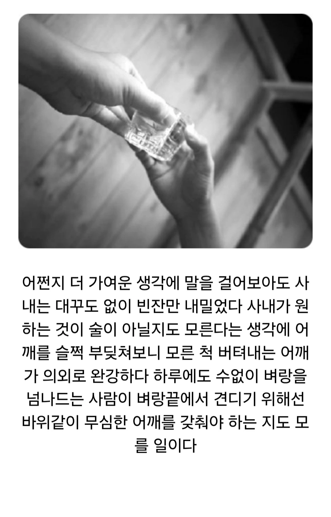 어쩌지 더 가여운 생각에 말을 걸어보아도 사내는 대꾸도 없이 빈 잔만 내밀었다 사내가 원하는 것이 술이 아닐지도 모른다는 생각에 어깨를 슬쩍 부딪쳐보니 모른 척 버텨내는 어깨가 완강하다. 하루에도 수없이 벼랑을 넘나드는 사람이 벼랑 끝에서 견디기 위해선 바위같이 무심한 어깨를 갖춰야 하는지도 모를 일이다