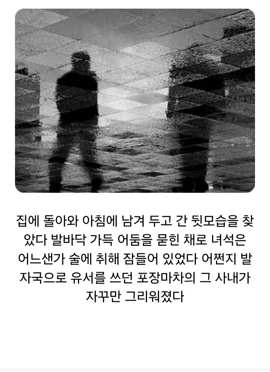 집에 돌아와 아침에 남겨두고 간 내 뒷모습을 찾았다. 발바닥 가득 어둠을 묻힌 채로 녀석은 어느샌가 술에 취해 잠들어 있었다 어쩐지 발자국으로 유서를 쓰던 포장마차의 그 사내가 자꾸만 그리워졌다