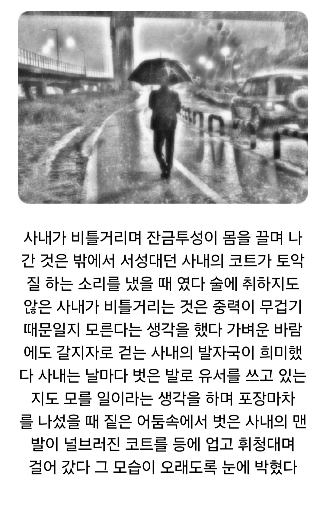 사내가 비틀거리며 잔금투성이 몸을 끌고 나간 것은 밖에서 서성대던 사내의 코트가 토악질하는 소리를 냈을 때였다 술에 취하지도 않은 사내가 비틀거리는 것은 중력이 무겁기 때문일지도 모른다는 생각을 했다 가벼운 바람에도 갈지자로 걷는 사내의 발자국이 희미했다 사내는 날마다 벗은 발로 유서를 쓰고 있는지도 모를 일이라는 생각을 하며 포장마차를 나섰을 때 짙은 어둠 속에서 벗은 사내의 맨발이 널브러진 코트를 등에 업고 휘청대며 걸어갔다 그 모습이 오래도록 눈에 박혔다