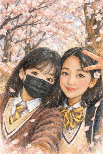 벚꽃 만발한 교정에서 활짝 웃고 있는, 귀여운 단발머리 소녀.