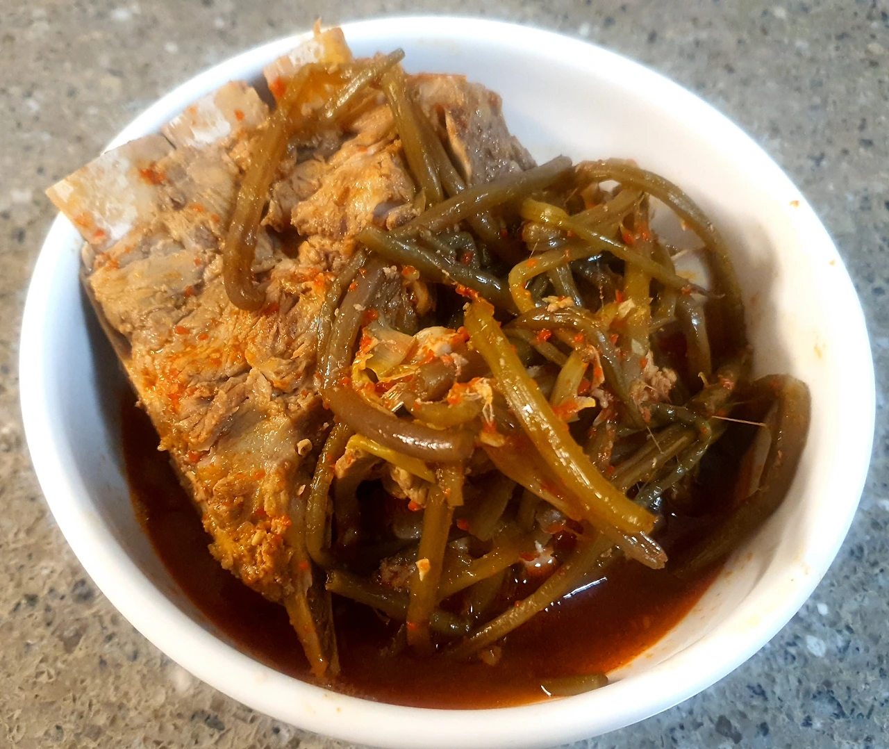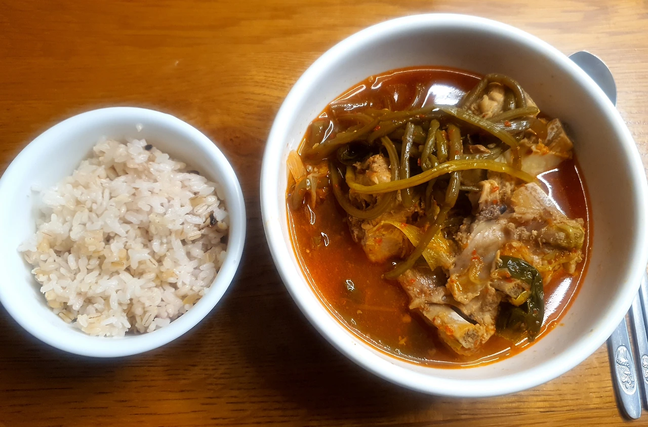 이번엔 무청시레기 대신 데쳐놓은 고구마순을 넣어본다. 전주에 꽤 유명한 뼈다귀감자탕 집이 있는데 특이하게도 그집은 시레기 대신 말린 고구마순을 삶아 넣어주는데, 그 맛이 또 별미다. 첨엔 그 시도가 너무 낯설어서 신기했는데, 먹어보니 식감도 쫄깃하고, 보들보들 하니, 시레기 못지 않은 맛을 냈다. 그래서 이번에 마침 고구마 캐러 갔다가 가져온 고구마순을 데쳐놓은 것이 있어 나도 그 흉내를 내본다.