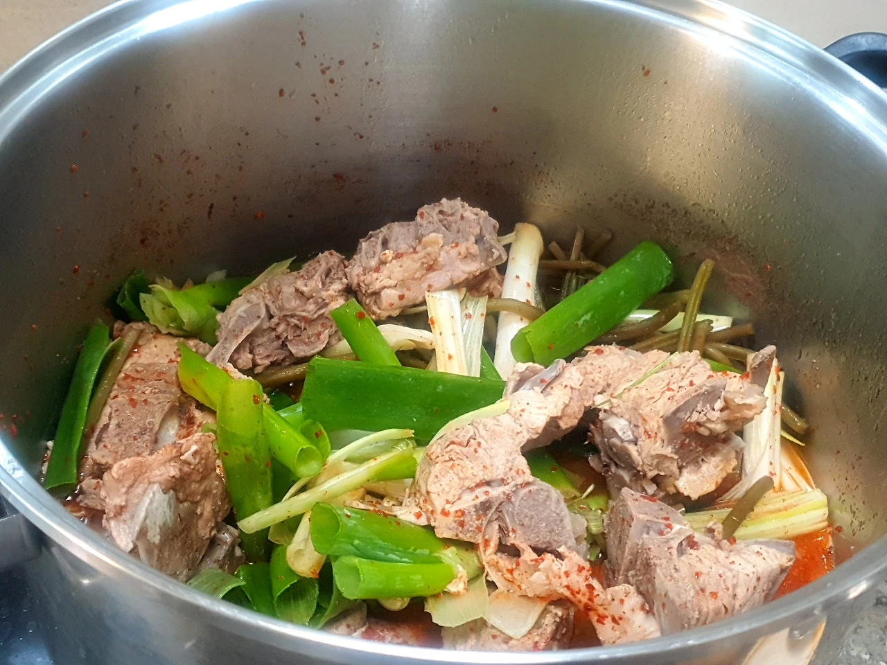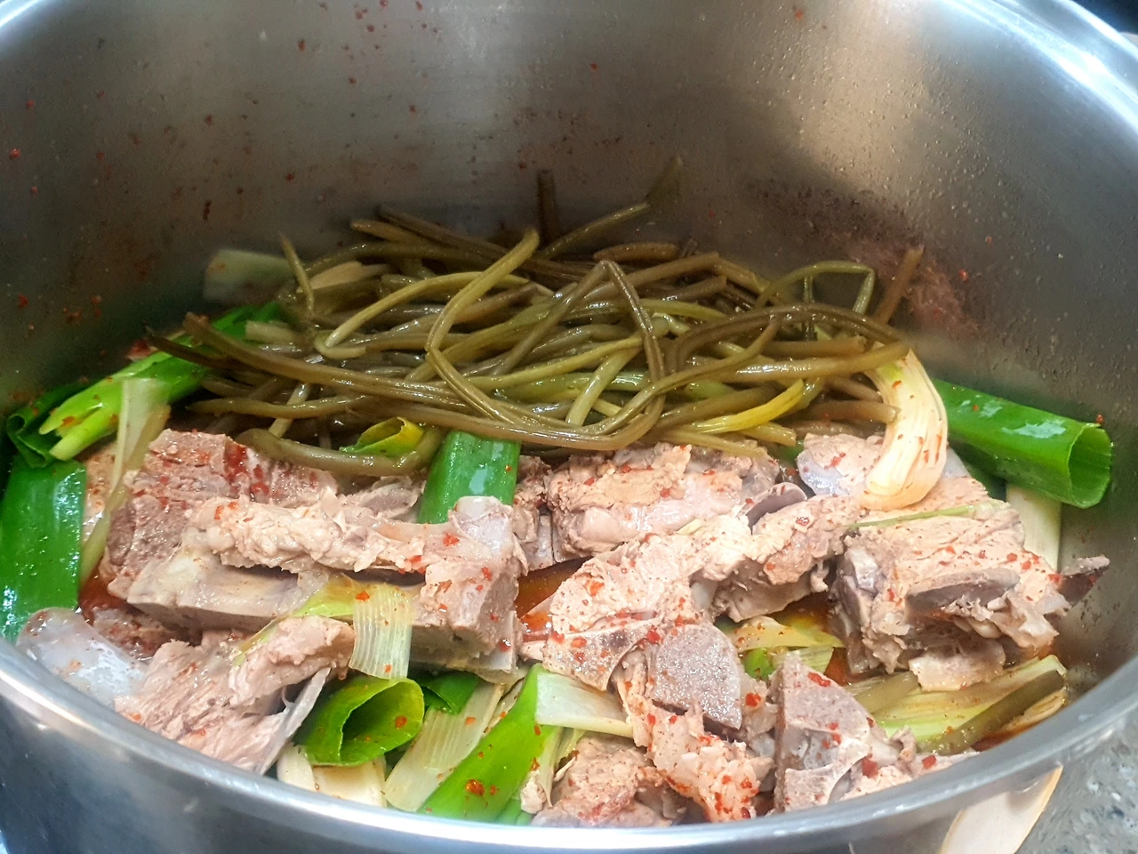 국물도 진하게, 고기도 푹 잘 익었다 싶으면 고춧가루, 파, 마늘, 새우젓을 넉넉히 넣어 준다. 그리고 이때 손질된 무청시레기나 살짝 데친 우거지를 넉넉히 넣어 다시 한번 그 맛과 간이 어우러지도록 푹 끓여준다.