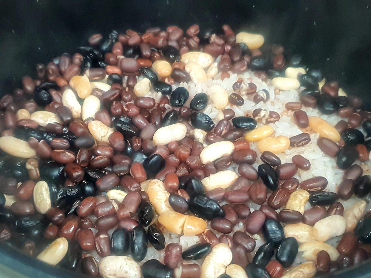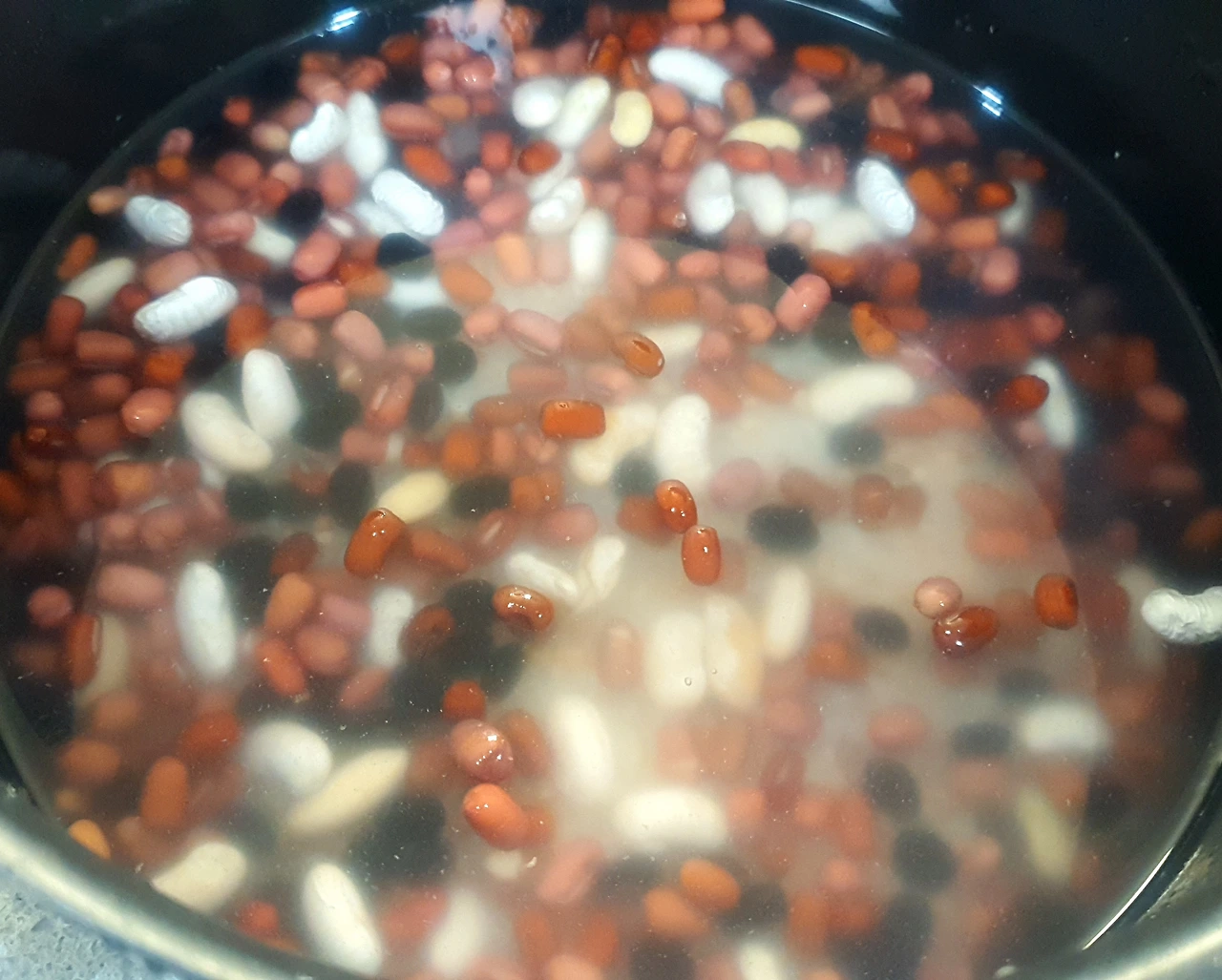 수수, 팥, 검은콩, 찹쌀, 현미쌀, 강낭콩등 전통 있는 오곡 대신 우리 집 곡물창고가 허락하는 잡곡으로 되는대로 준비했다. 깨끗이 씻은 쌀과 충분히 불린 잡곡들을 합채 해서 물 넉넉히 넣어 오곡을 흉내 낸 잡곡밥을 준비한 것이다.